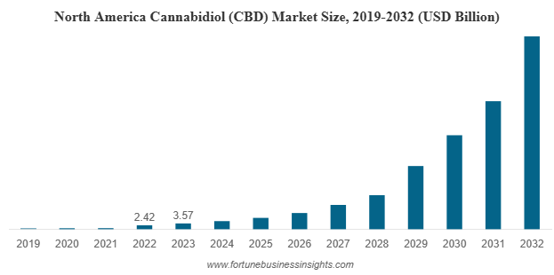 North America – The region stood at USD 7.59 billion in 2023 and is anticipated to hold the highest position in the market in the forthcoming years. This is attributable to the favourable government policies that enable the commercialization of cannabidiol products in countries such as the U.S. and Canada.